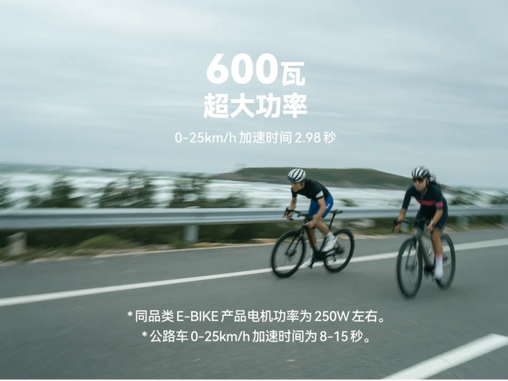 车重仅15千克,配置全碳纤维零部件、电子变速和协议快充的电助力公路车。